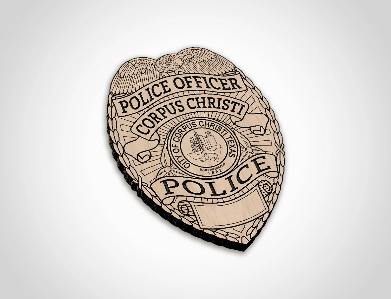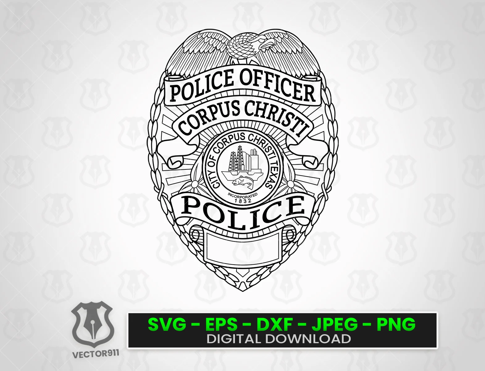 Our Corpus Christi Texas Police Officer Badge Badge SVG vector files are crafted to be compatible with today’s most popular CNC, Laser, and Vinyl Cutting Applications. The included SVG, EPS, DXF, and PNG formats allow for customization of products that honor the officers of the Corpus Christi Texas Police Department and their commitment to maintaining safety and peace within the community.